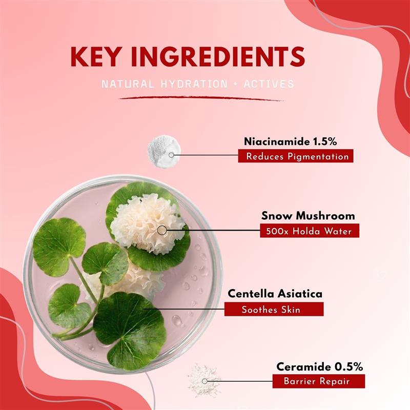 Glow with powerful natural skincare ingredient Snow Mushroom + Centella Asiatica with combination of Niacinamide 1.5% and Ceramide 0.5%. Perfect for all skin types, especially oily, combination & dehydrated skin, it absorbs instantly—leaving your skin fresh, plump, and naturally glowing.