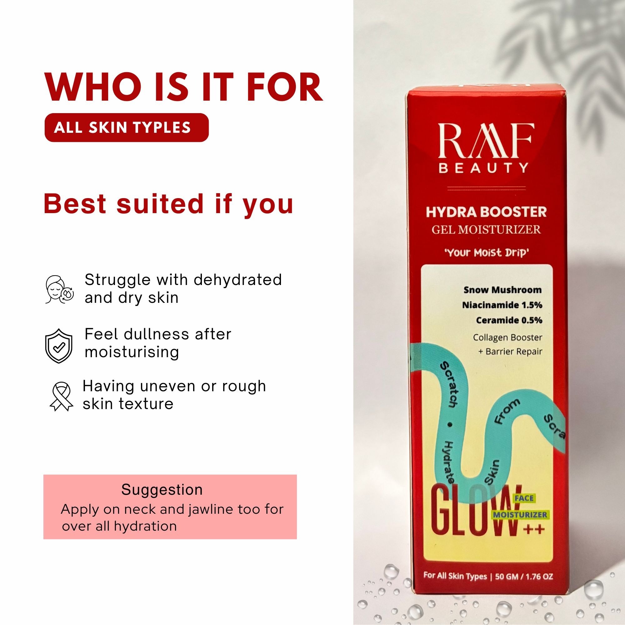 Hydra Booster Gel Moisturizer – Glow++ is a refreshing, fast-absorbing gel moisturizer designed to deeply hydrate, strengthen the skin barrier, and enhance your natural glow. The combination of Korean ingredient Snow Mushroom and Centella Asiatica with modern actives like Niacinamide and Ceramide to create a pure, lightweight “Moist Drip” comfort and restores your skin’s natural balance for 72 hours, it visibly improves skin texture, strengthen the barrier, and boost radiance. Perfect for all skin types, especially oily, combination & dehydrated skin, it absorbs instantly—leaving your skin fresh, plump, and naturally glowing.